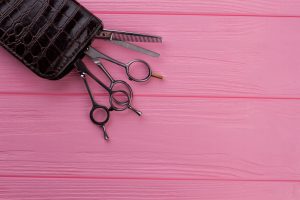 Professional barber scissors on pink background.
